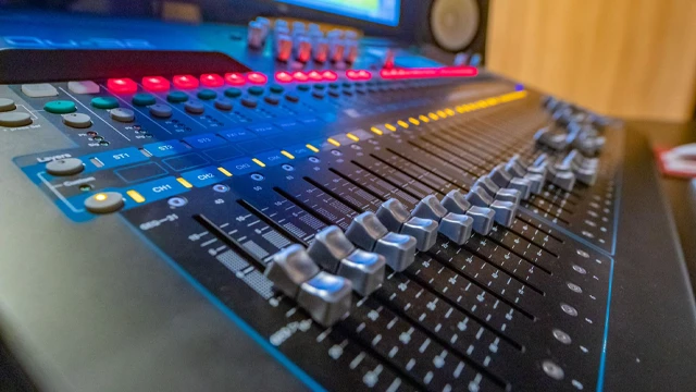 Mesa de mixagem profissional com monitores de alta precisão